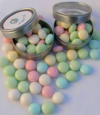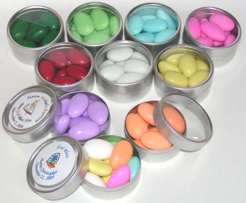 | Jordan Almonds filling: Super fine Jordan almonds with thin sugar coating available in 7 pastel colors or assorted. Each tin fits 9 almonds. Kosher certified. |
