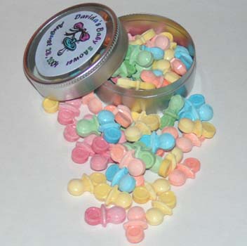 | Candy Pacifiers Filling: Fruit flavored, assorted colors candy pacifiers (approximately 35 pieces). |